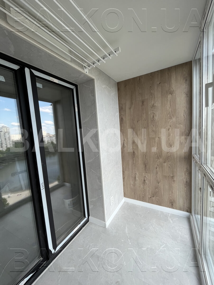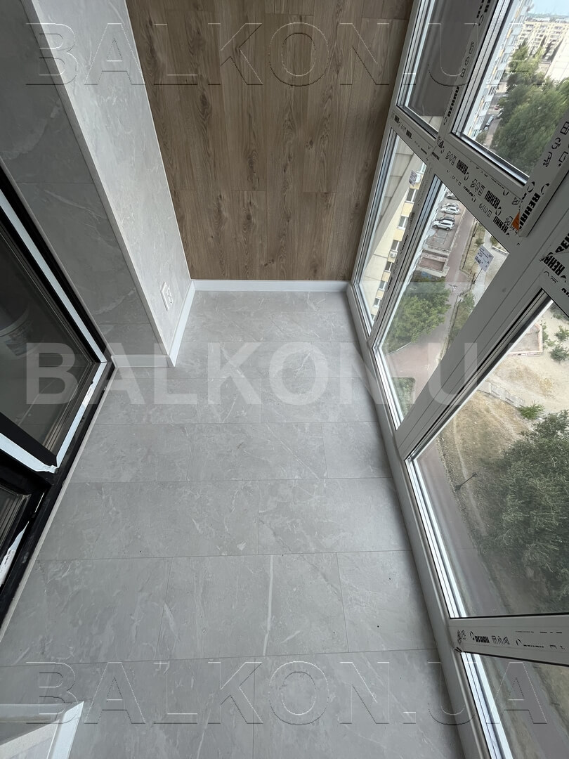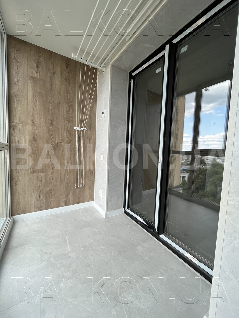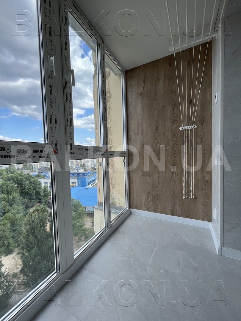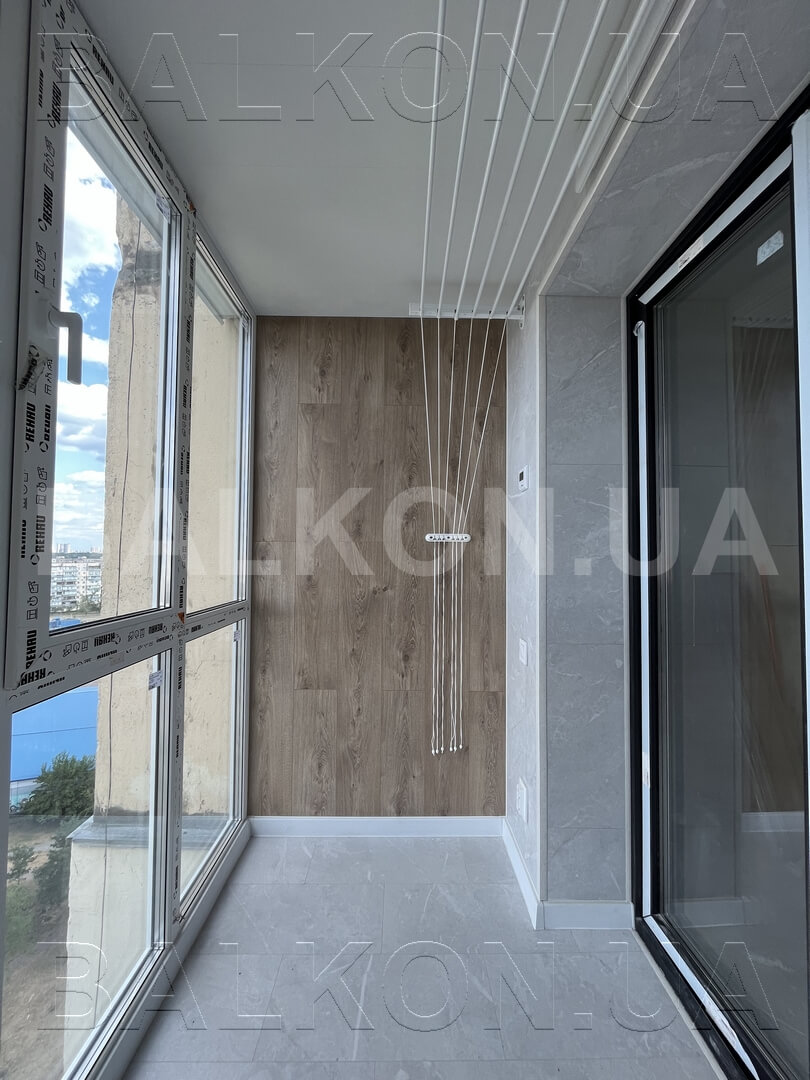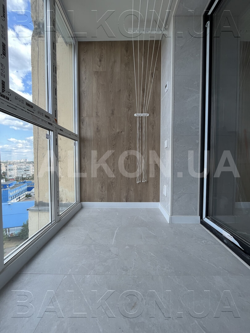 – Розширення по підлозі на 35 см – Панорамне скління – Утеплення балкону – Оздоблення дерево – Сушарка, розетки – Вбудована тумбочка